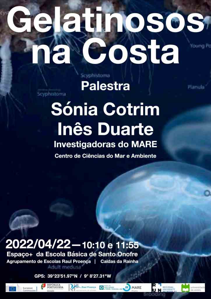 Na manhã do passado dia 22 de abril, no Espaço + da Escola Básica de Santo Onofre (EB_SO) decorreu uma palestra intitulada “Gelatinosos na Costa”, dinamizada pelas Investigadoras Sónia Cotrim e Inês Duarte do MARE (Marine and Environmental Sciences Centre), centro de investigação da Escola Superior de Turismo e Tecnologia do Mar, Politécnico de Leiria. Sónia Cotrim é doutorada em Ecologia do Zooplâncton e Inês Duarte é mestre em Aquacultura de Medusas.